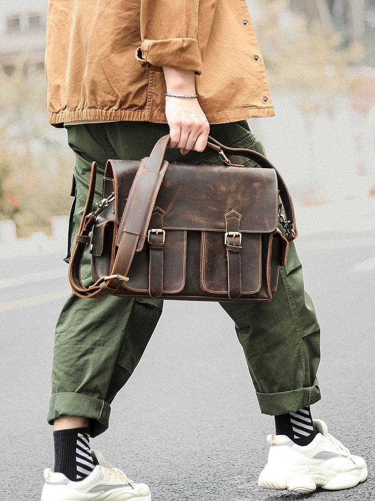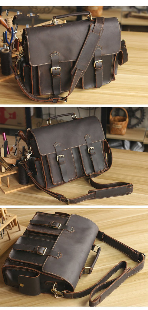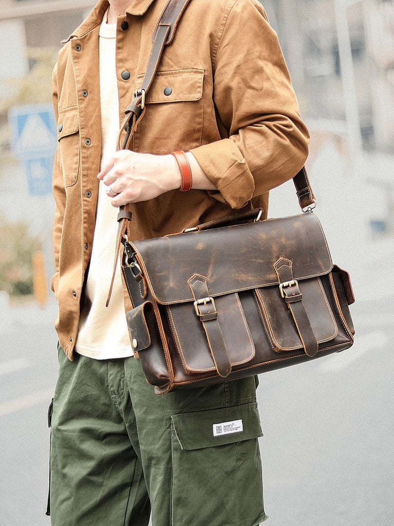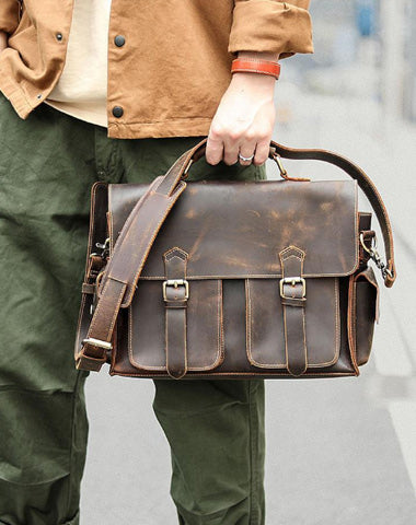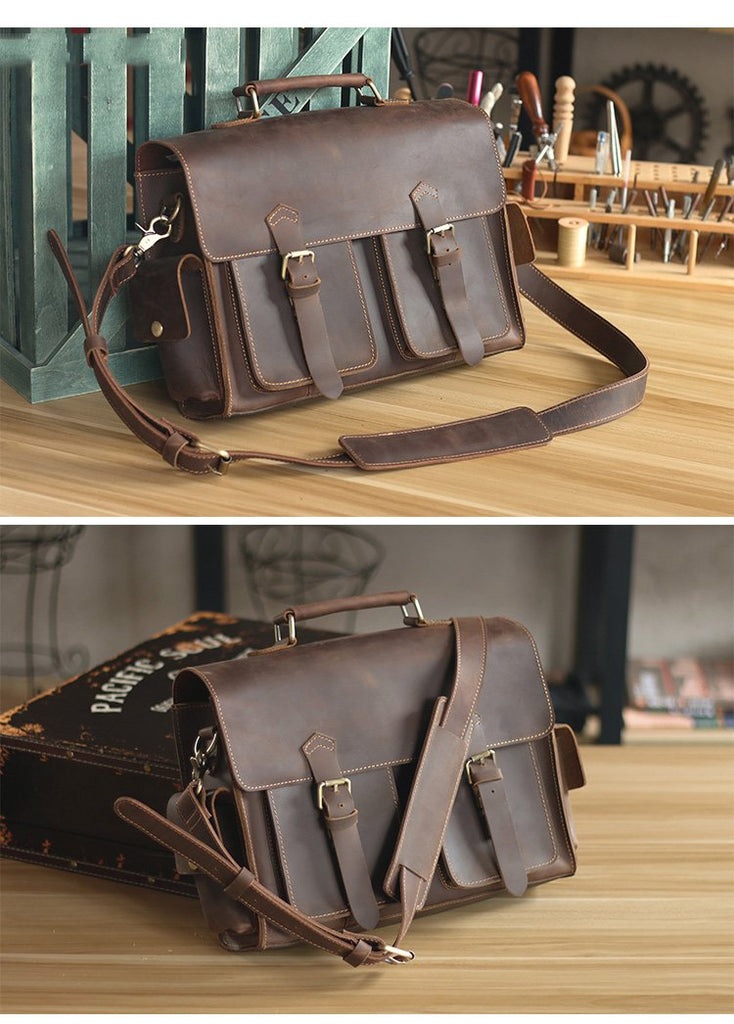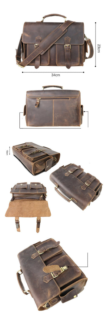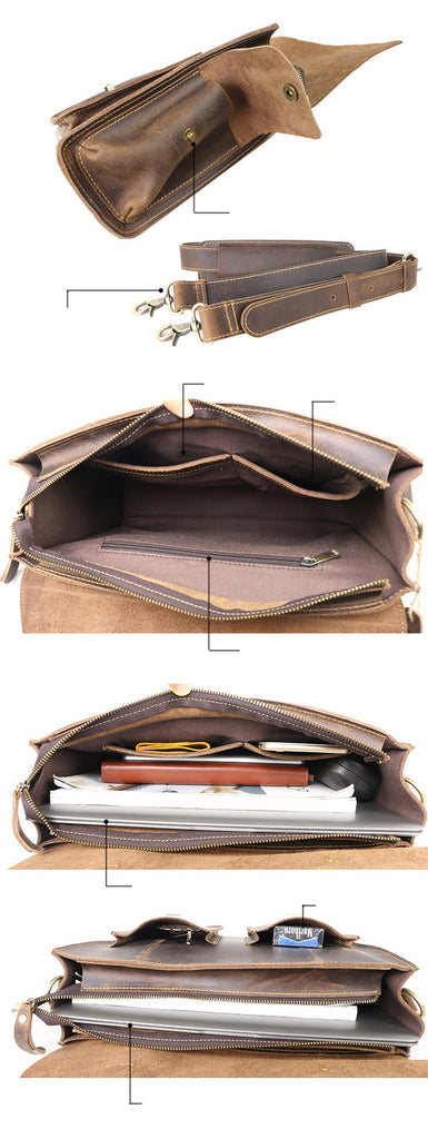 Design: Retro Deep Brown Leather Mens 14 inches Briefcase Dark Gray Work Briefcase Handbags For Men