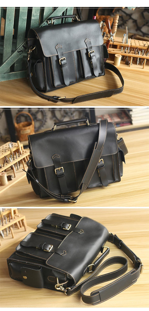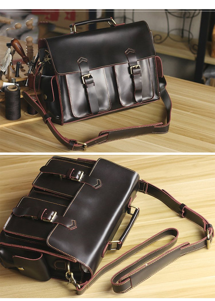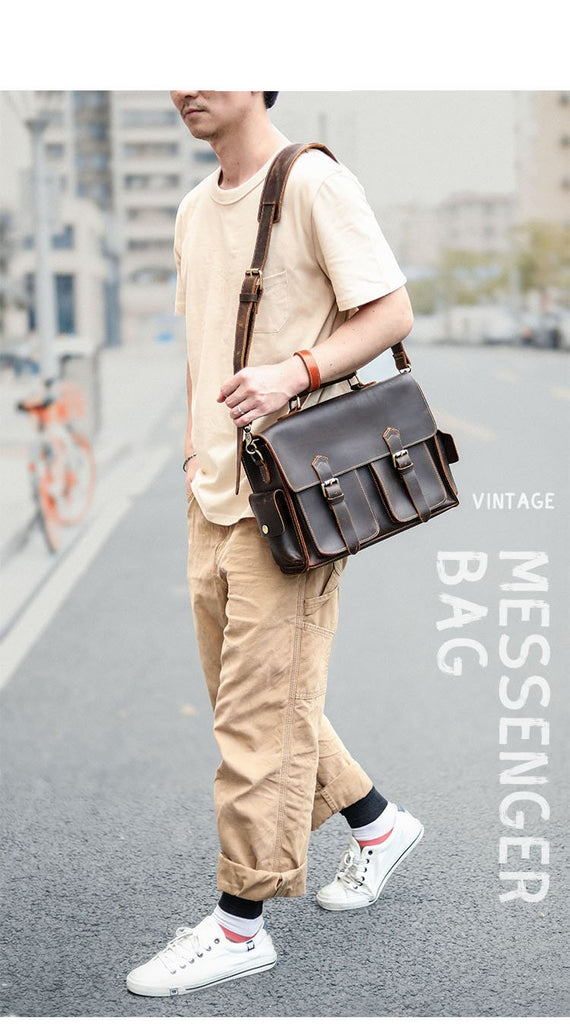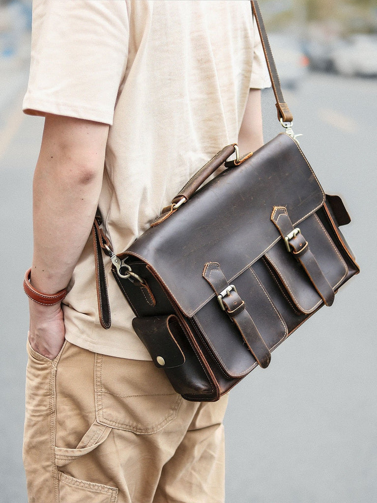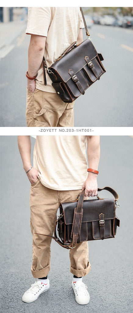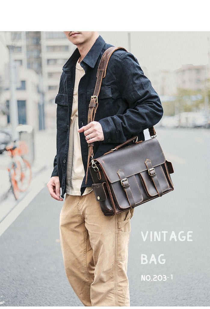 Design: Retro Deep Brown Leather Mens 14 inches Briefcase Dark Gray Work Briefcase Handbags For Men
