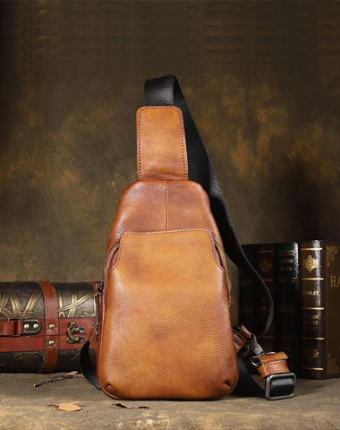 Style: Retro Handmade Brown Leather Mens Sling Bag Sling Shoulder Bag Chest Bag for men