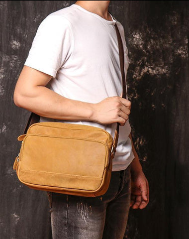 Design: Simple Yellow Brown Leather Men's Vertical Side Bag 10inch Vertical Messenger Bag For MenOverview: