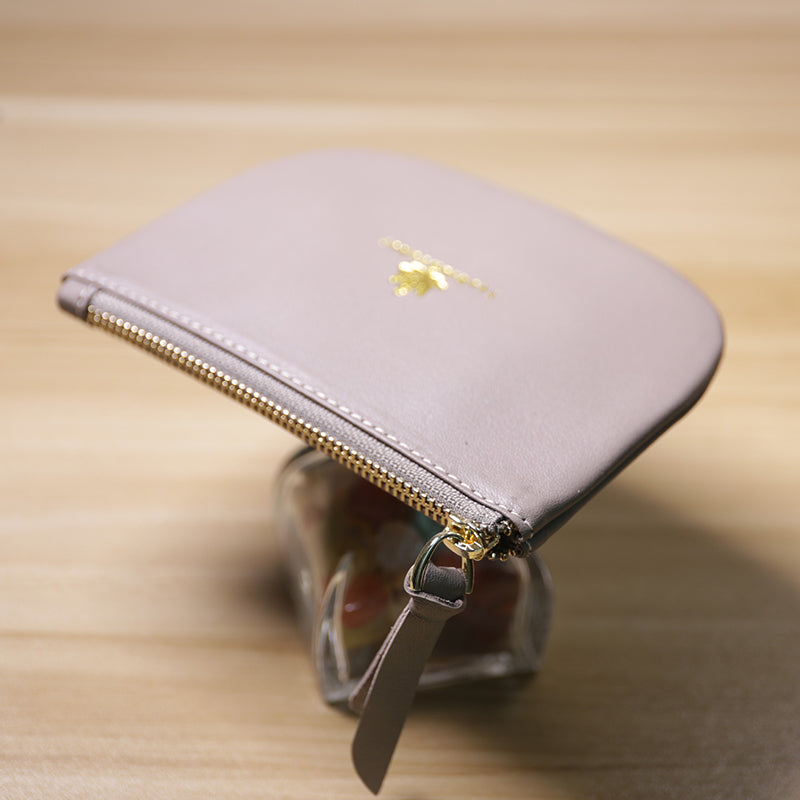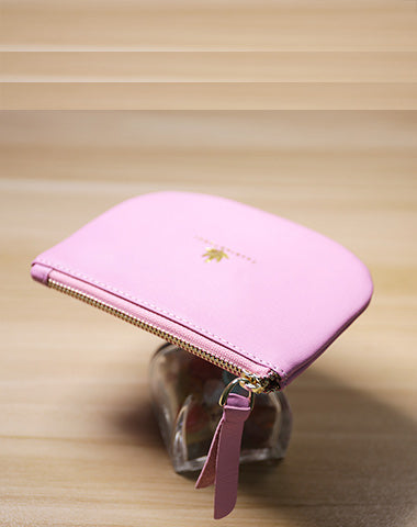 Slim Women Pink Leather Zip Card Wallet Saddle Minimalist Coin Wallet Small Zip Change Wallet For Women