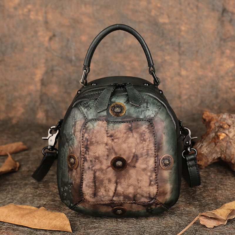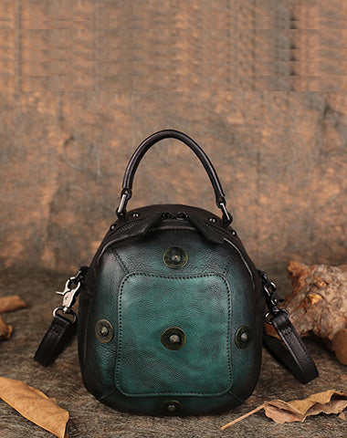 Small Green Leather Womens Rivets Shoulder Bag Barrel Small Handmade Handbag Purse for Ladies