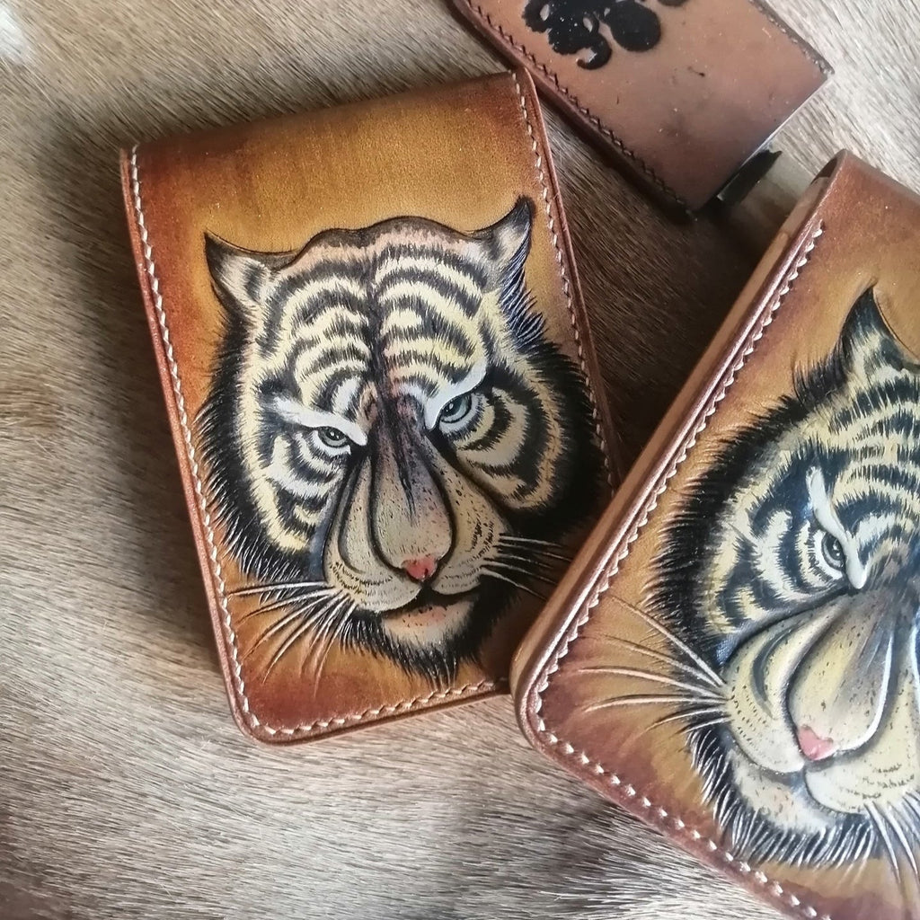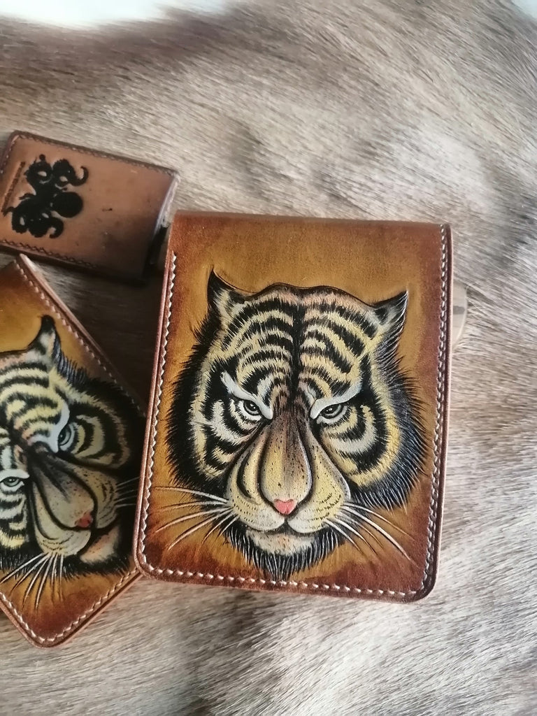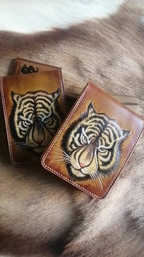 Design: Tiger Tooled Leather Wallet Card Wallet with ID Window Tiger ID Holder Wallet Mens Wallet with ID Window
