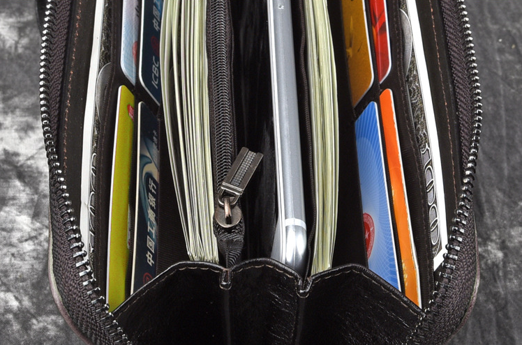 Slots: 2 full size bill slot, 12 card holders, 1 zipper Slot,