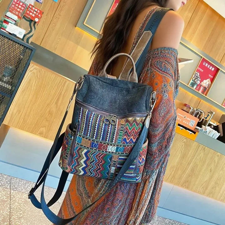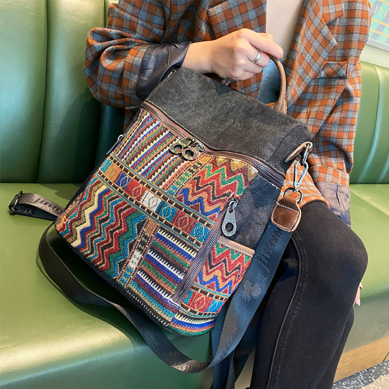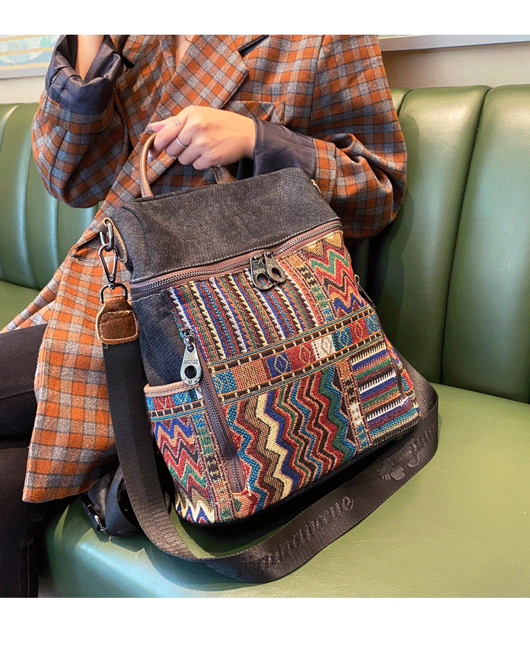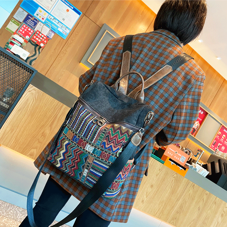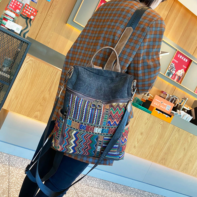 Design: Vintage Convertible Large Boho Style Backpack Boho Crossbody Bag Black Gray Embroidery Canvas Backpack