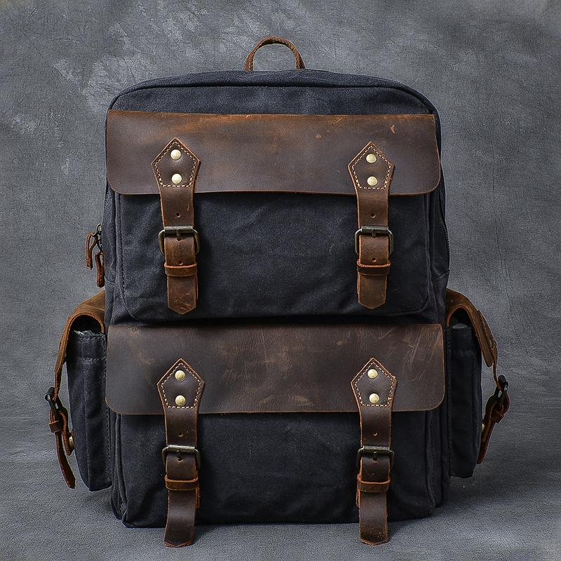 Design: Waxed Canvas Leather Mens 15" Laptop Backpack Army Green Travel Backpack Dark Gray College Backpack for Men