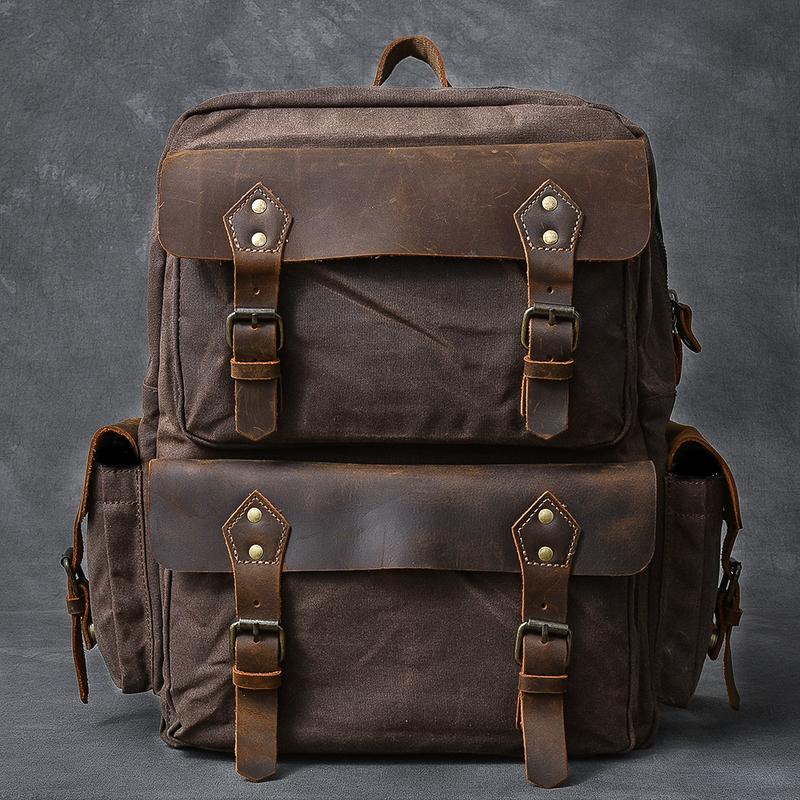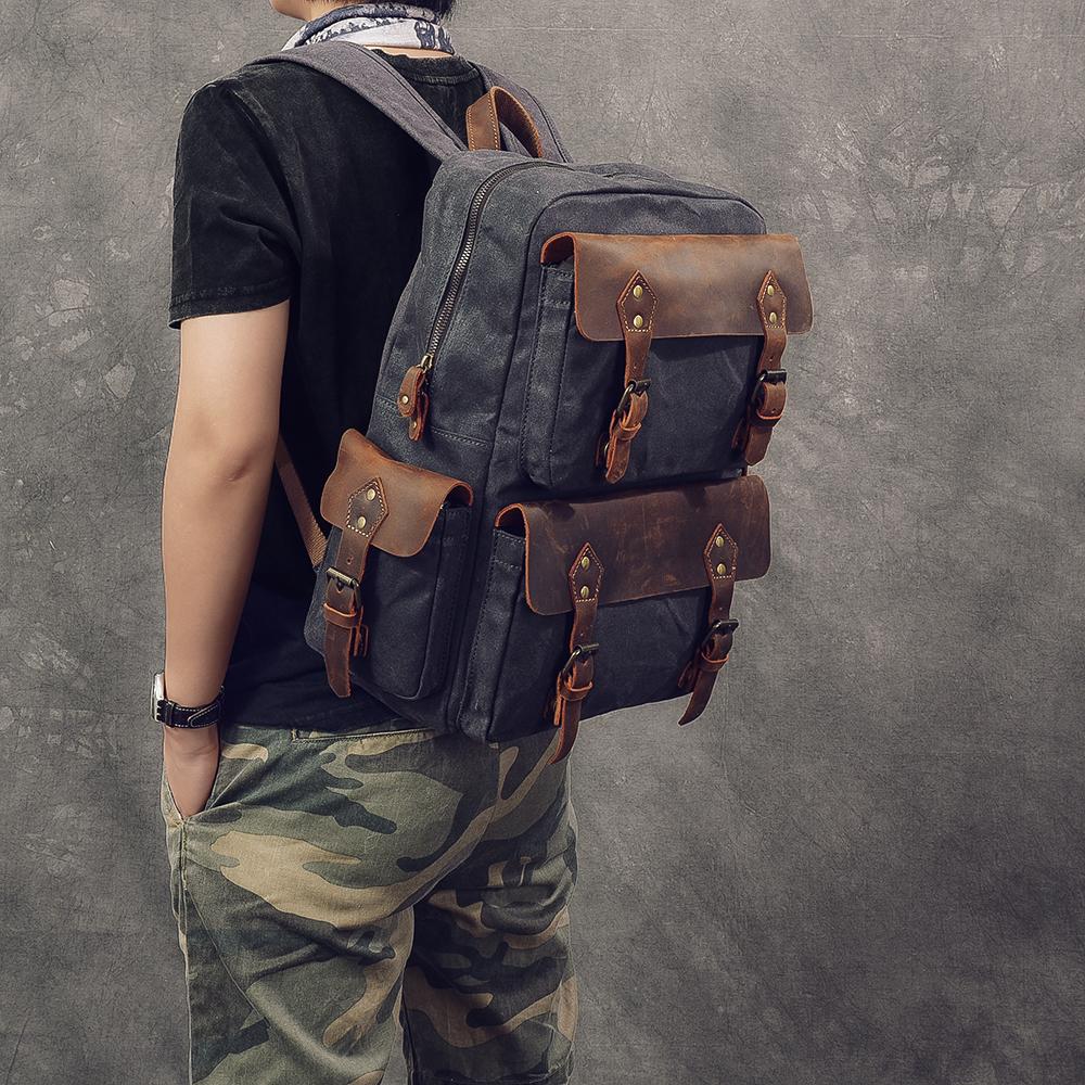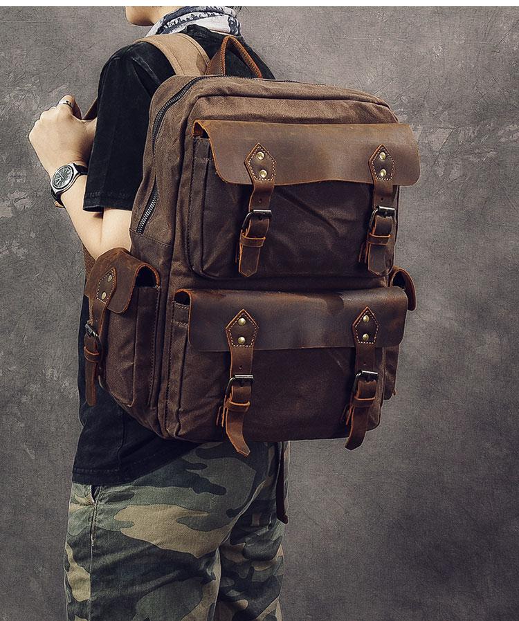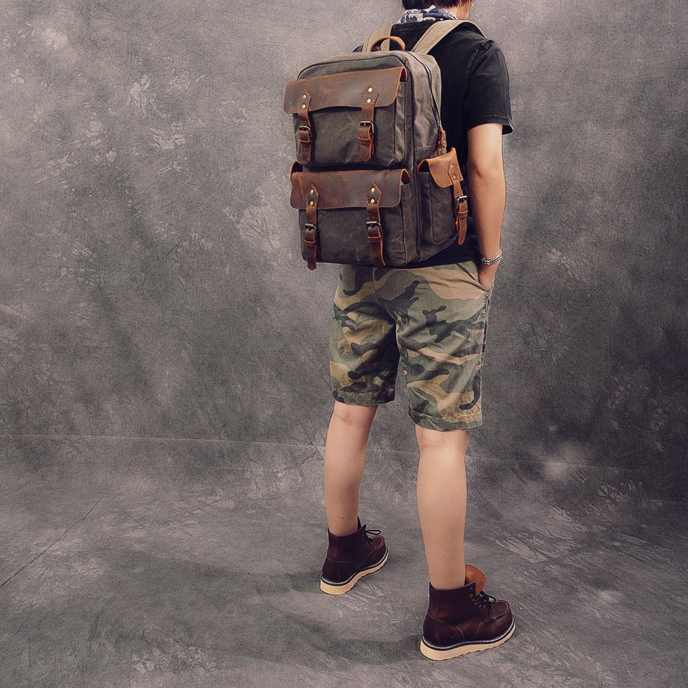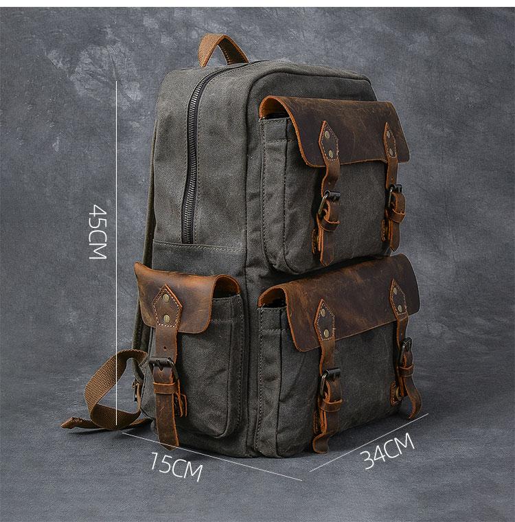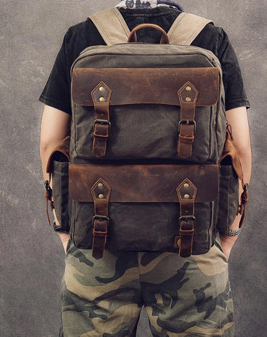 Style: Waxed Canvas Leather Mens 15" Laptop Backpack Army Green Travel Backpack Dark Gray College Backpack for Men