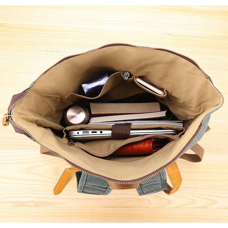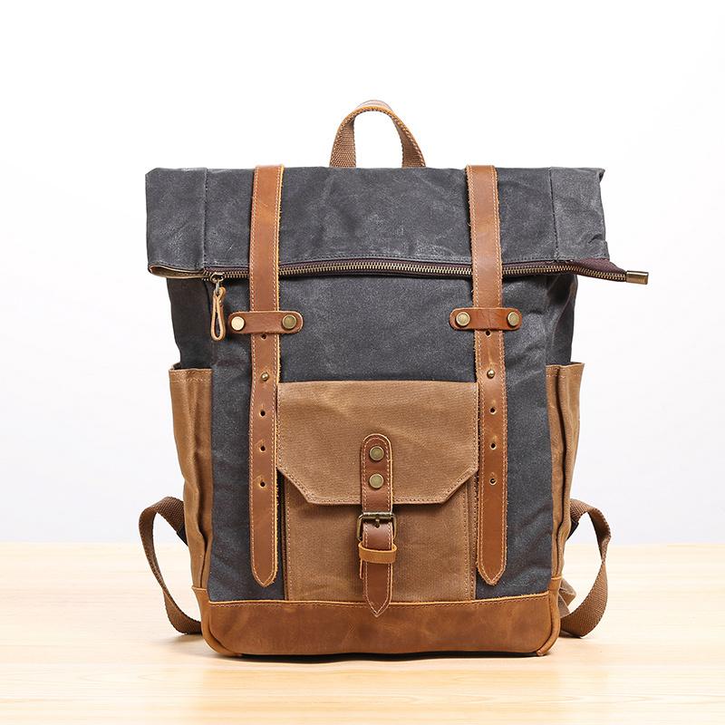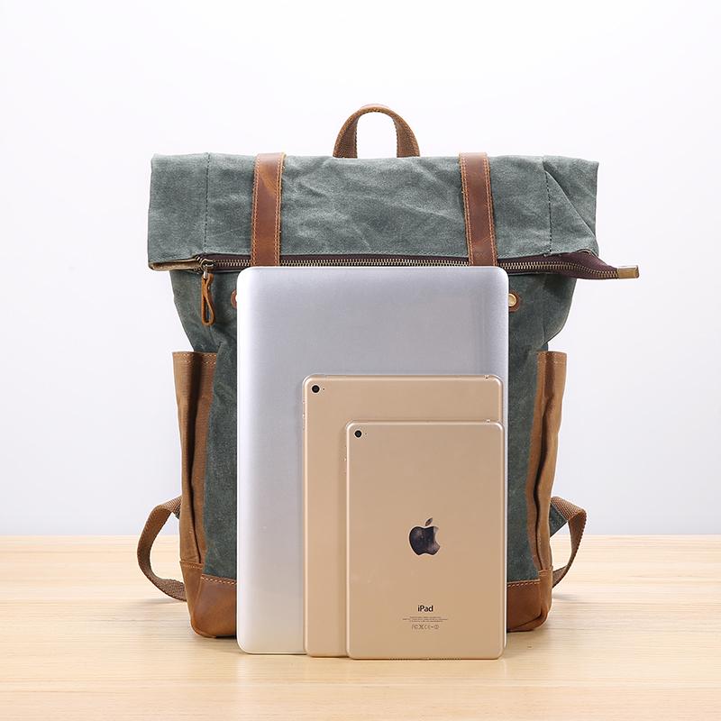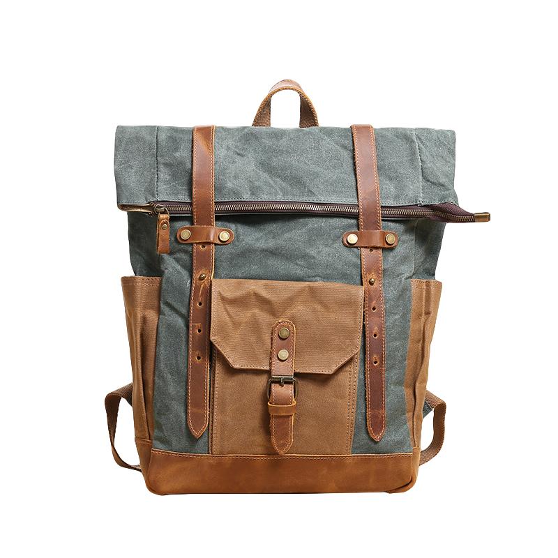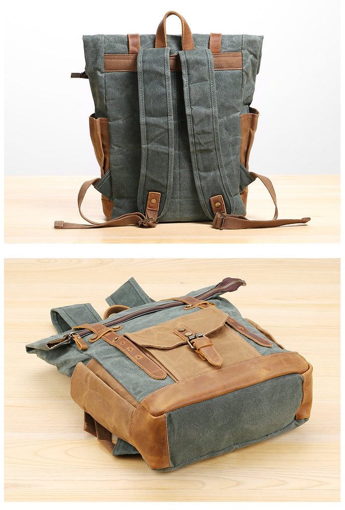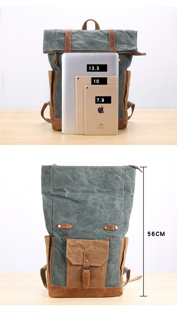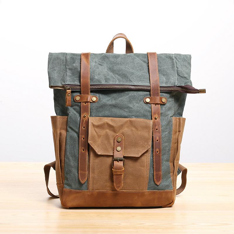 Design: Waxed Canvas Leather Mens 17‘’ Lake Green Backpack Khaki Travel Backpack Dark Gray Hiking Backpack for Men