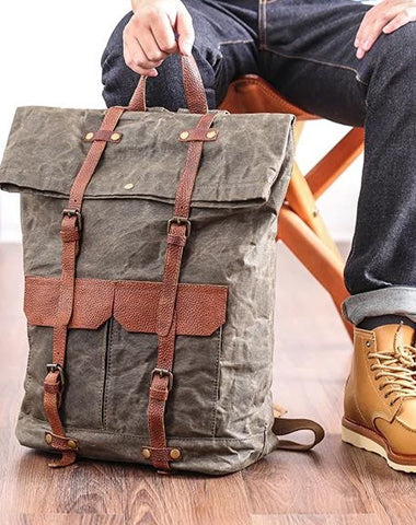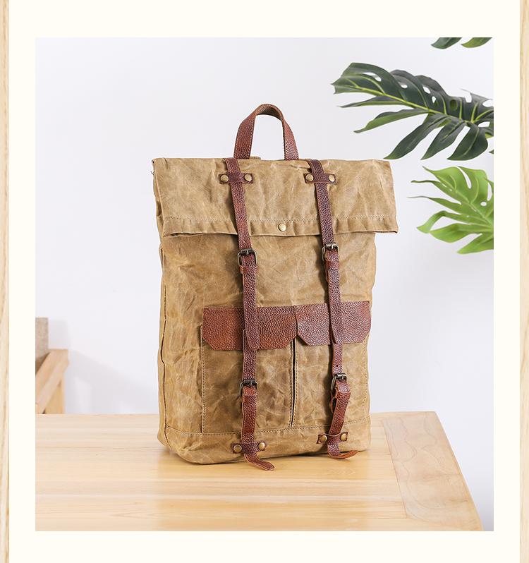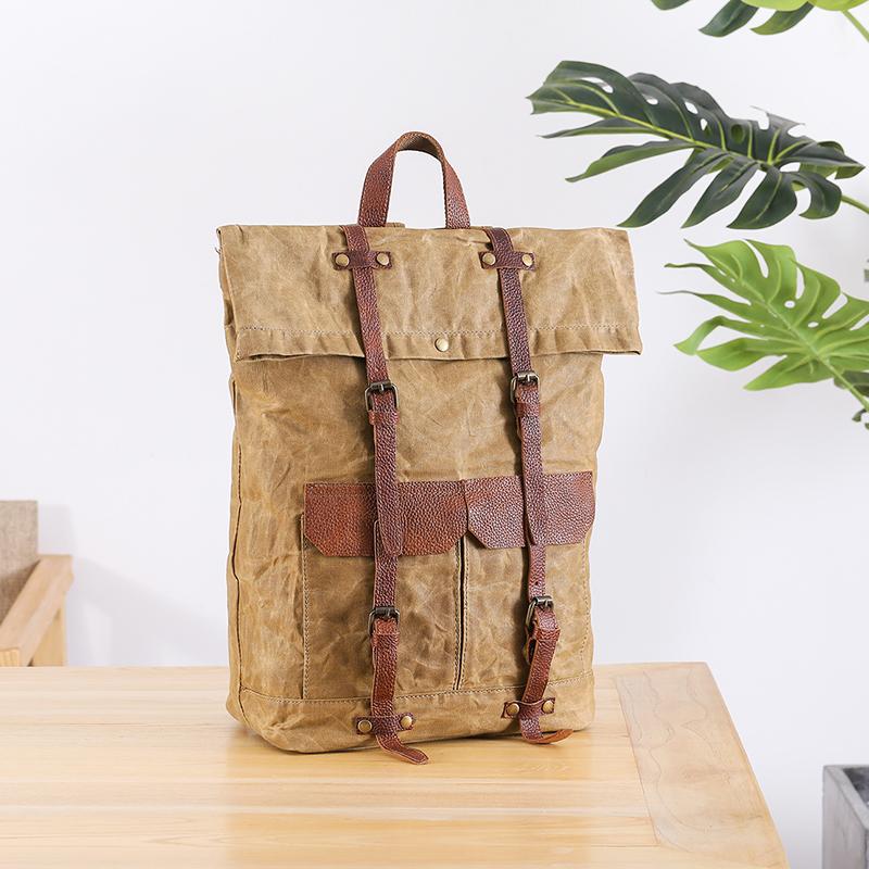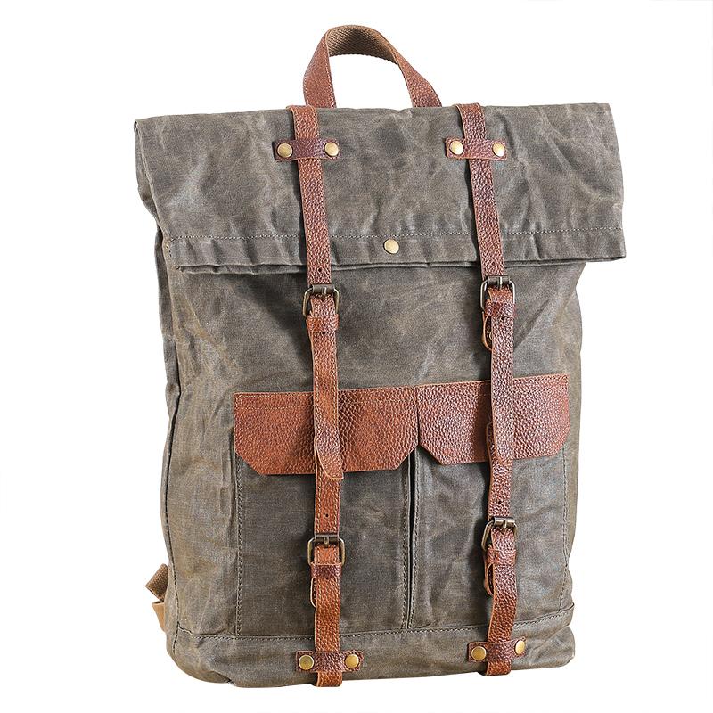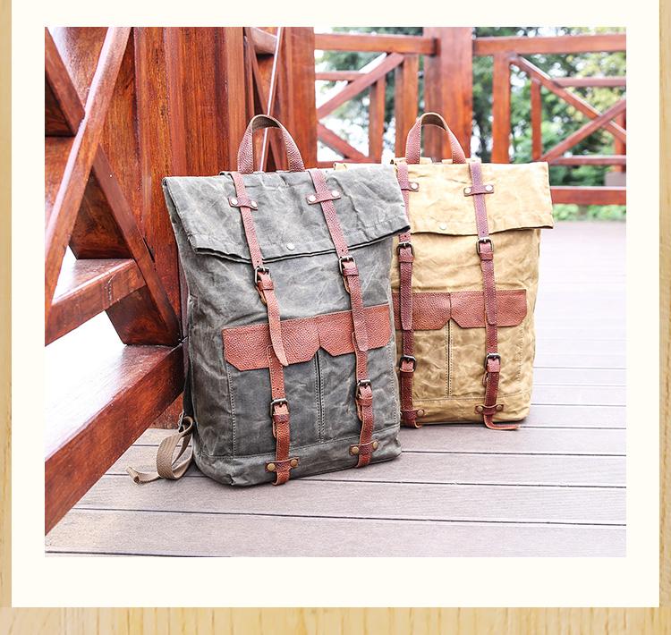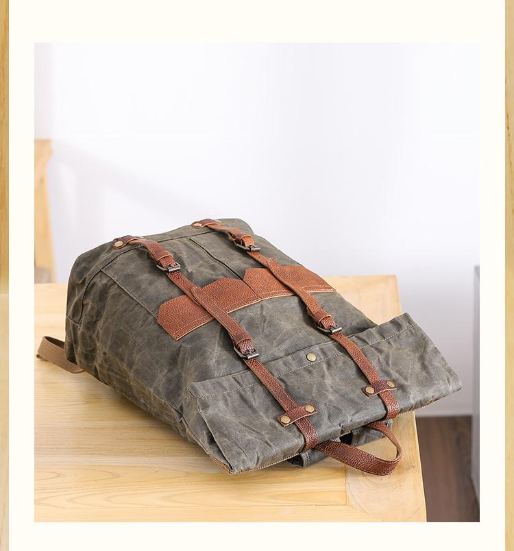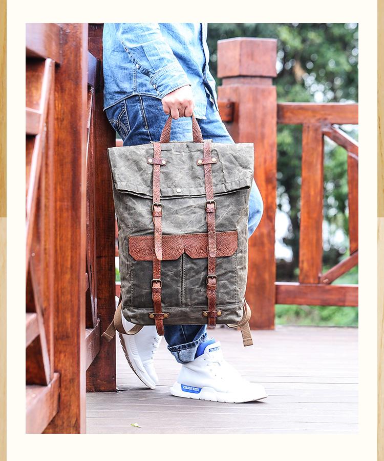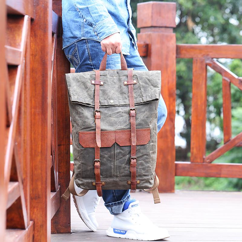 Design: Waxed Canvas Leather Mens Army Green Waterproof Backpack Khaki Travel Backpack Hiking Backpack for Men