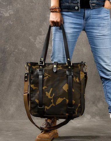 Design: Waxed Canvas Leather Mens Womens 14'' Camouflage Tote Bag Handbag Tote Bag Shoulder Bag Tote Purse For Men