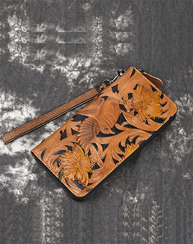 Womens Bird Floral Tan Leather Wristlet Wallet Zip Around Wallets Floral Ladies Zipper Clutch Wallet for Women