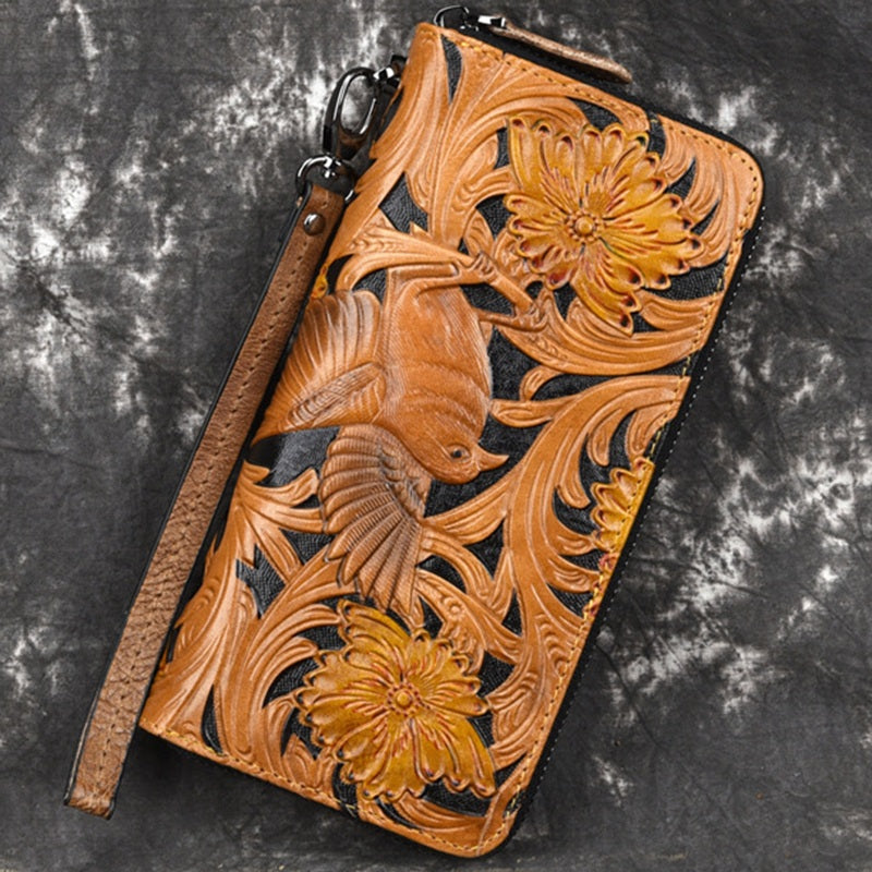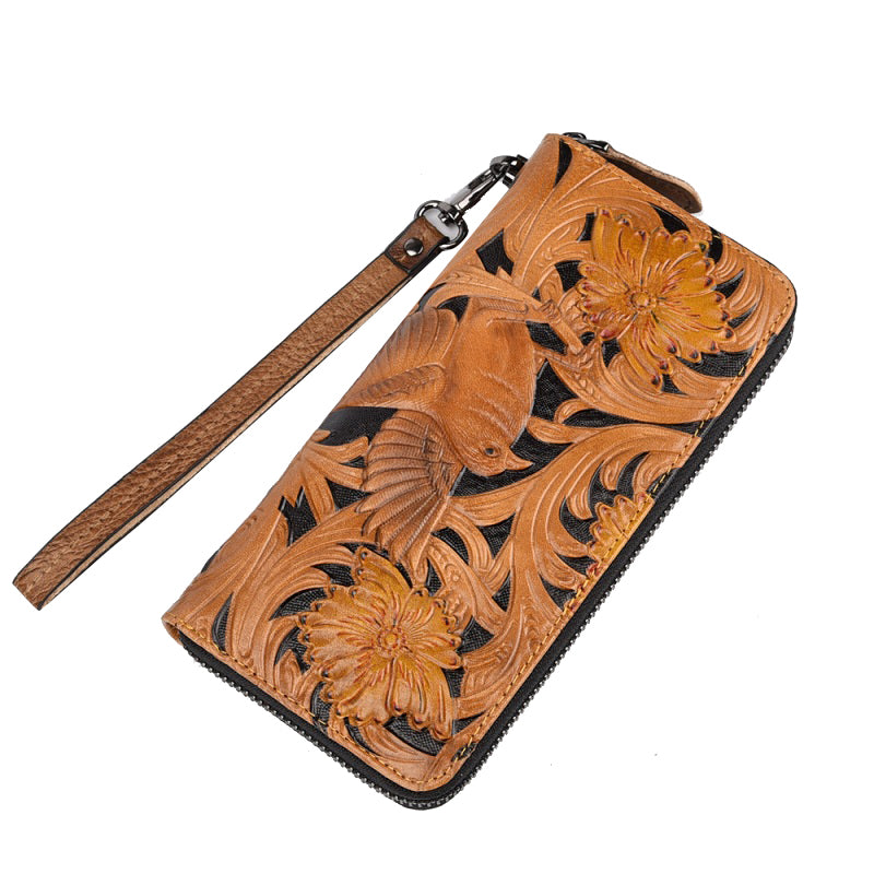 Style: Womens Bird Floral Tan Leather Wristlet Wallet Zip Around Wallets Floral Ladies Zipper Clutch Wallet for Women