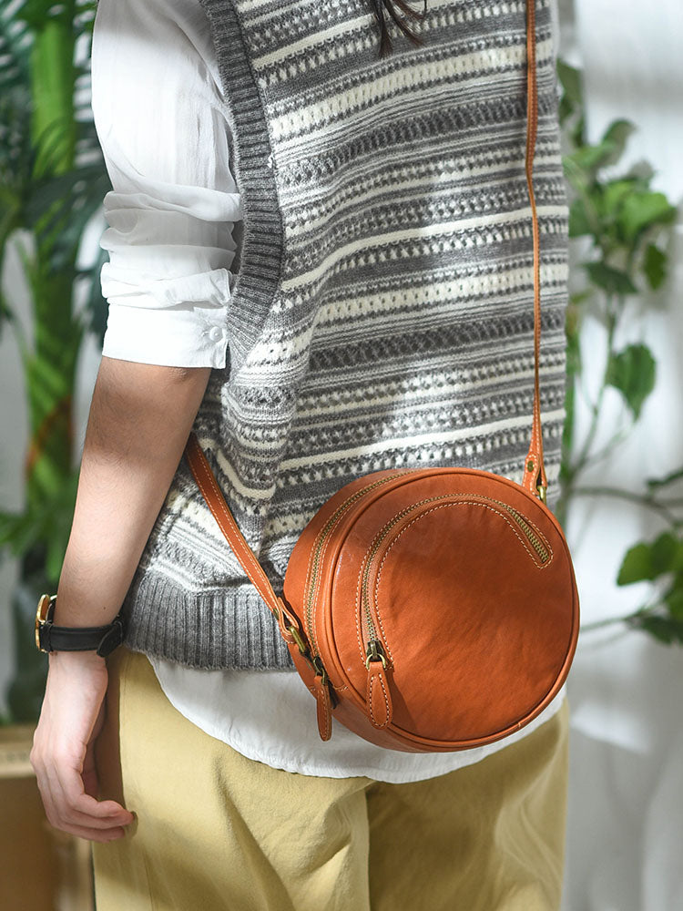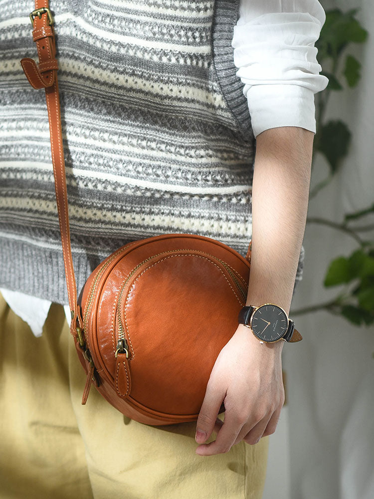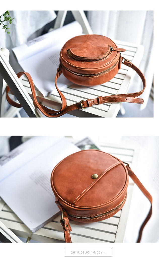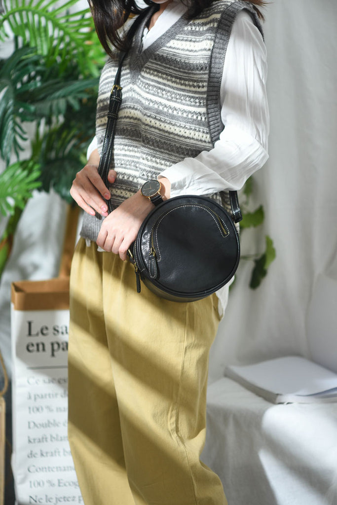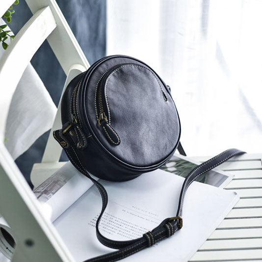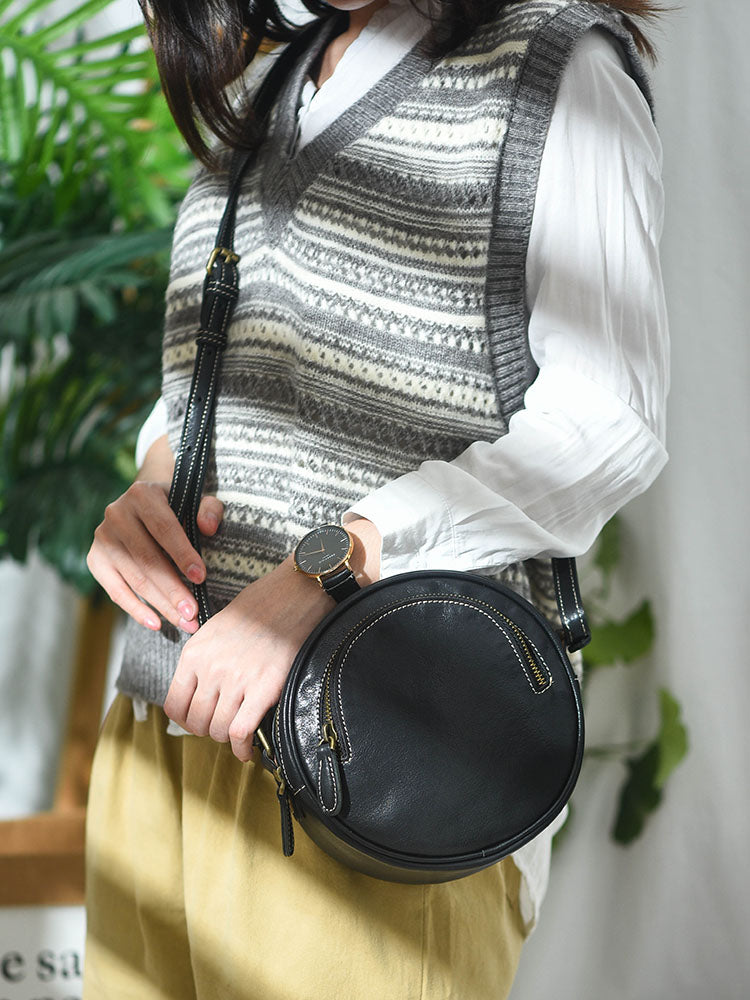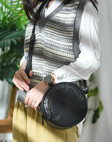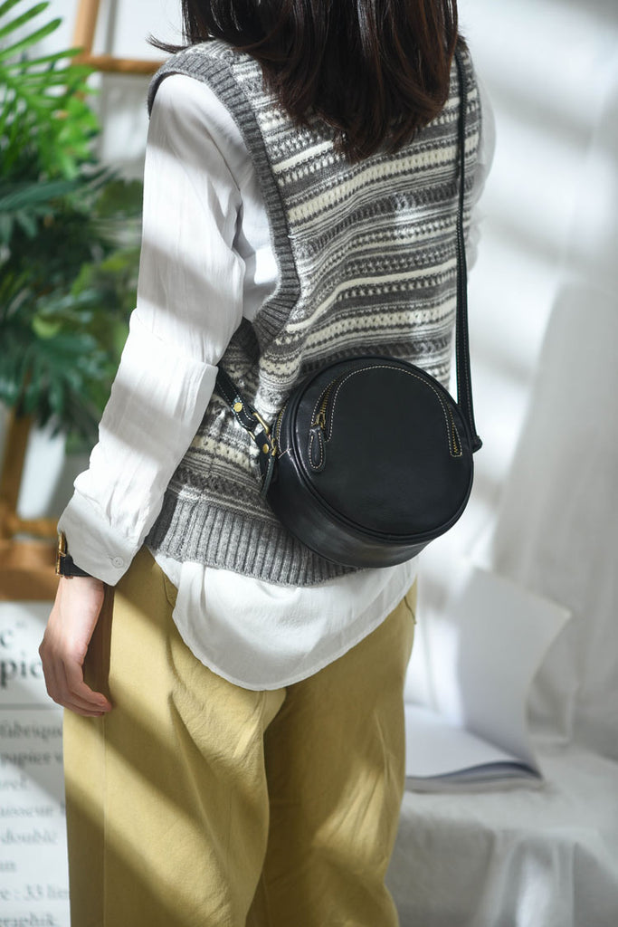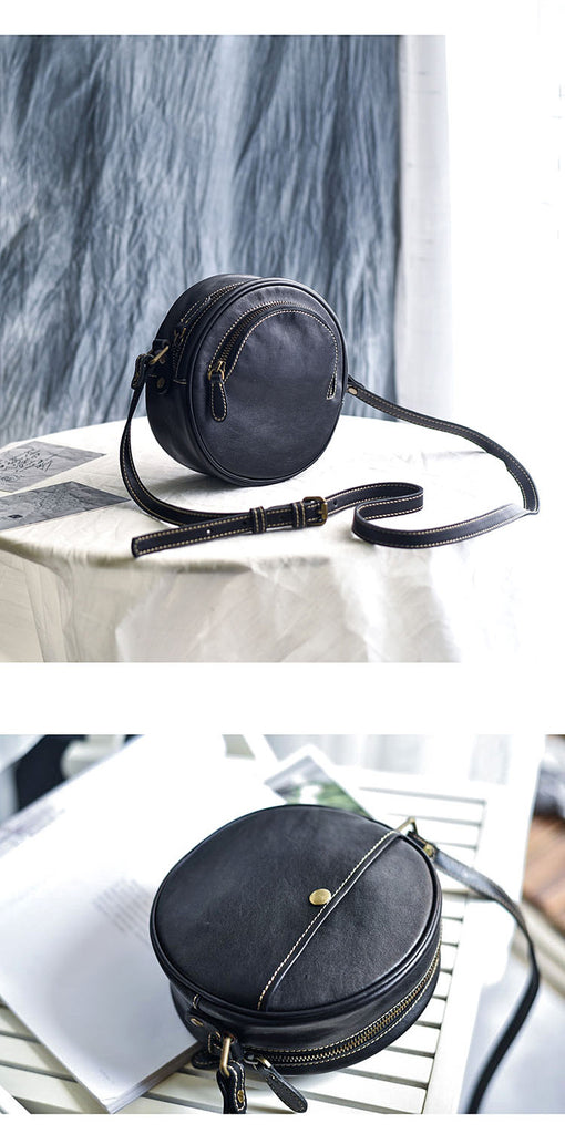 Design: Womens Black Leather Round Crossbody Bag Handmade Round Small Shoulder Bag for Women