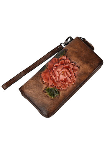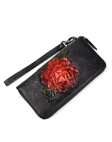 Style: Womens Black Leather Zip Around Wallet Peony Flower Wristlet Wallet Floral Ladies Zipper Clutch Wallet for Women