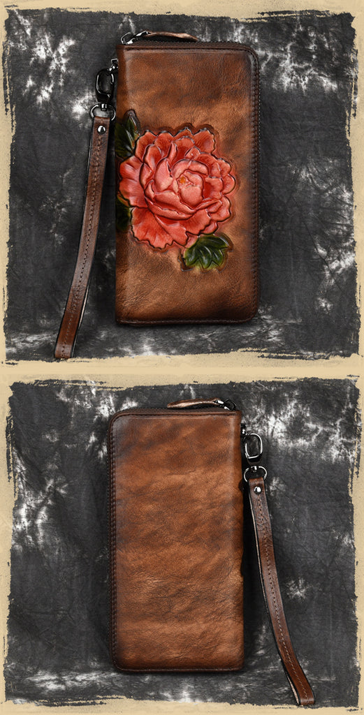 Design: Womens Black Leather Zip Around Wallet Peony Flower Wristlet Wallet Floral Ladies Zipper Clutch Wallet for Women