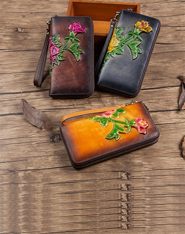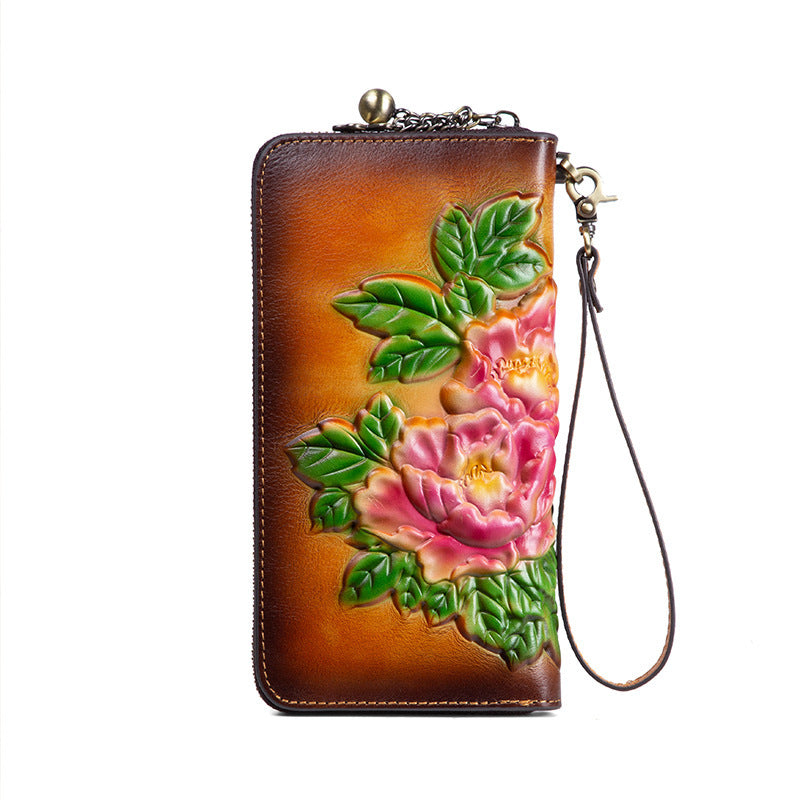 Design: Womens Leather Zip Around Wallet Peony Flower Wristlet Wallet Floral Ladies Zipper Clutch Wallet for Women