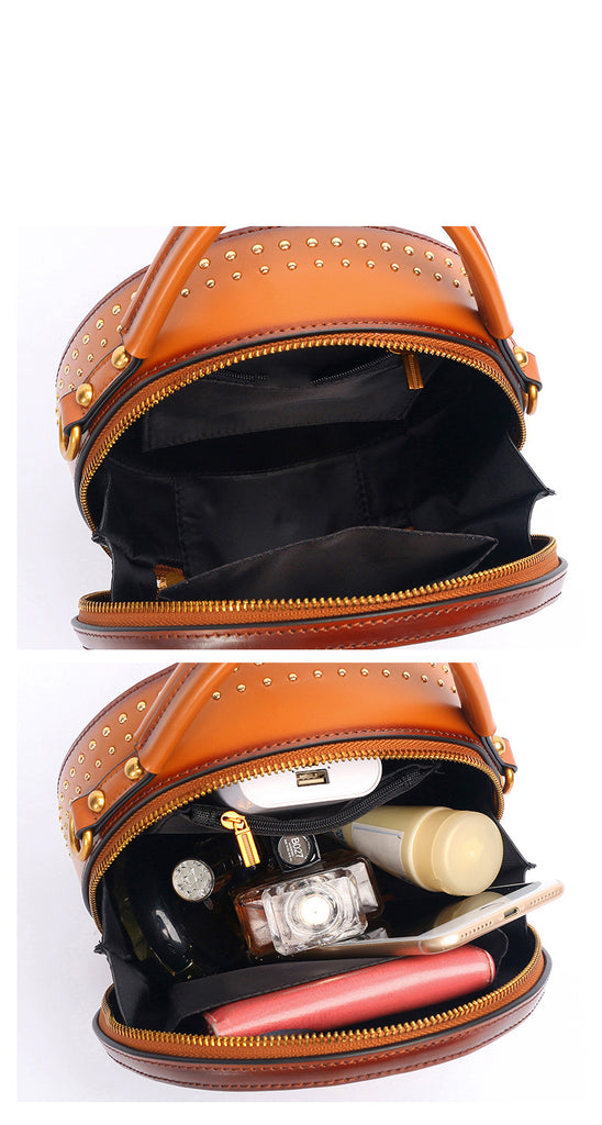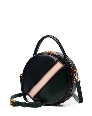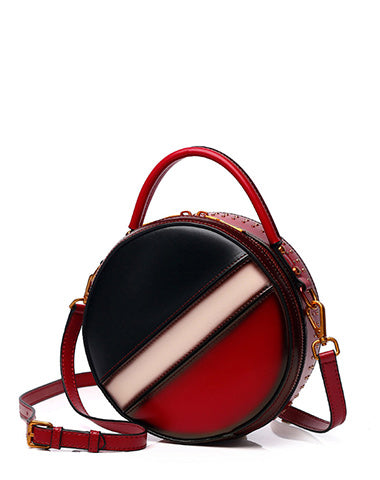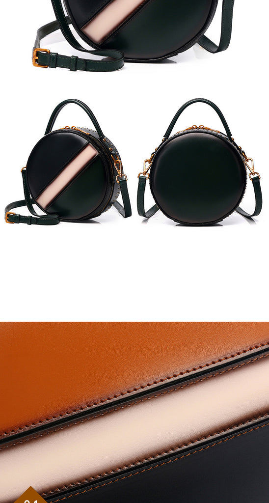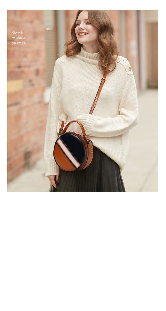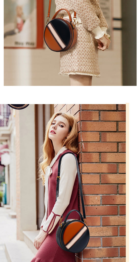Design: Womens Brown Leather Round Handbag CONTRAST COLOR Crossbody Purse Brown Round Shoulder Bag for Women