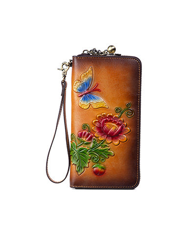 Womens Butterfly&Mums Flower Tan Leather Wristlet Wallets Zip Around Wallet Flower Ladies Zipper Clutch Wallet for Women