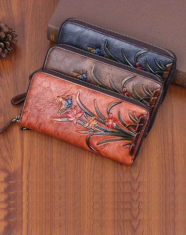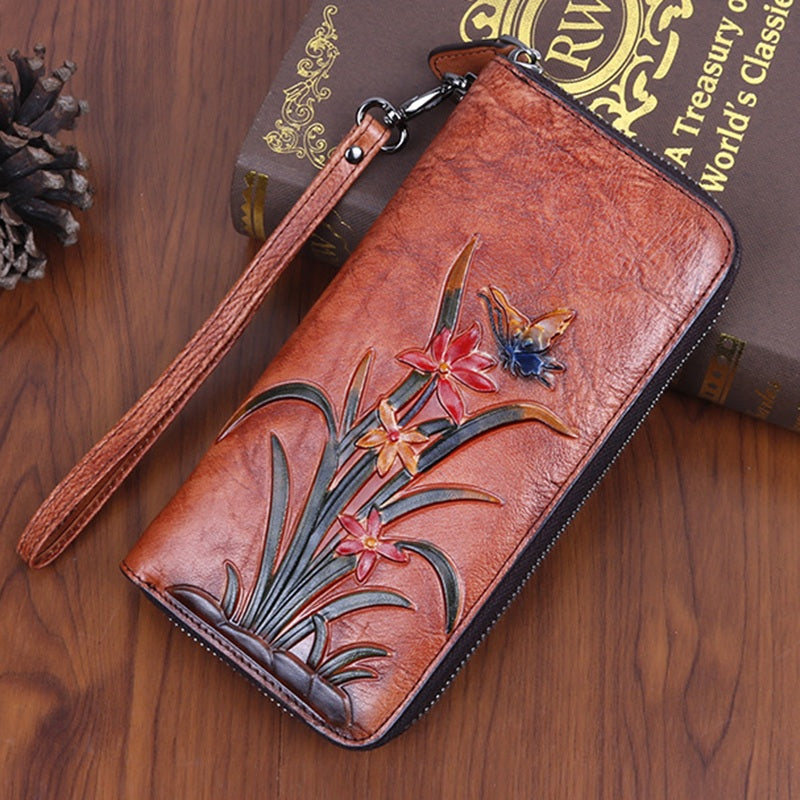Style: Womens Butterfly&Orchid Flower Leather Wristlet Wallets Zip Around Wallet Flower Ladies Zipper Clutch Wallet for Women