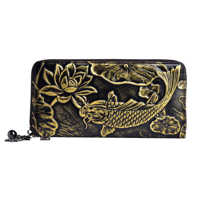 Style: Womens Carp&Lotus Flower Black Leather Zip Around Wallet Wristlet Wallet Floral Ladies Zipper Clutch Wallet for Women