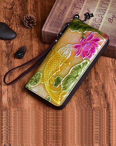 Style: Womens Carp&Lotus Flower Black Leather Zip Around Wallet Wristlet Wallet Floral Ladies Zipper Clutch Wallet for Women