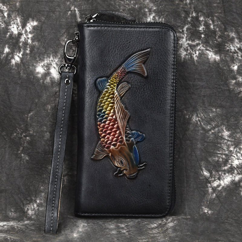 Design: Womens Carp Leather Zip Around Wallet Wristlet Wallet Carp Ladies Zipper Clutch Wallet for Women
