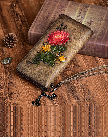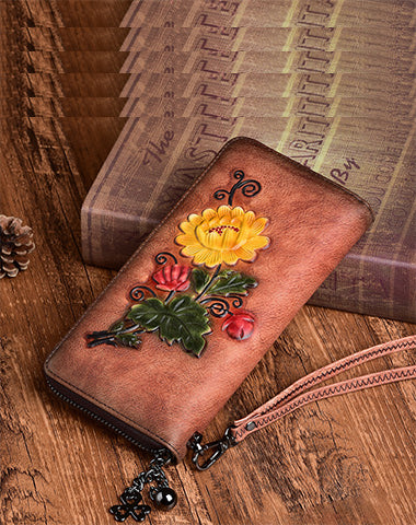 Design: Womens Coffee Leather Zip Around Wallet Chrysanthemum Flower Wristlet Wallet Floral Ladies Zipper Clutch Wallet for Women