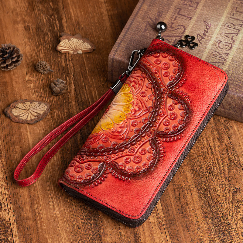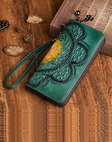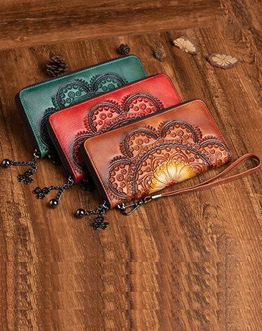 Womens Floral Brown Leather Wristlet Wallet Flower Zip Around Wallets Floral Ladies Zipper Clutch Wallets for Women