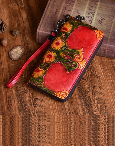 Womens Floral Red Leather Wristlet Wallets Flowers Zip Around Wallet Floral Ladies Zipper Clutch Wallet for Women
