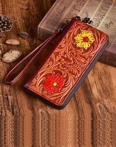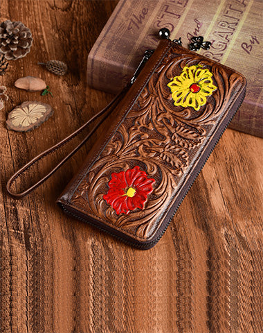 Style: Womens Flower Leather Wristlet Wallets Zip Around Wallet Floral Ladies Zipper Clutch Wallet for Women