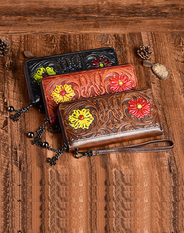 Womens Flower Leather Wristlet Wallets Zip Around Wallet Floral Ladies Zipper Clutch Wallet for Women
