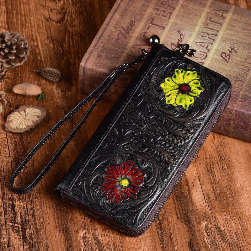 Design: Womens Flower Leather Wristlet Wallets Zip Around Wallet Floral Ladies Zipper Clutch Wallet for Women