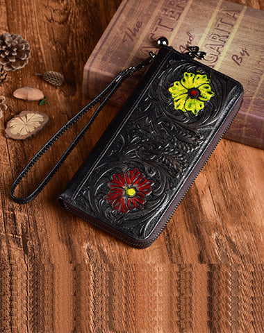Design: Womens Flower Leather Wristlet Wallets Zip Around Wallet Floral Ladies Zipper Clutch Wallet for Women