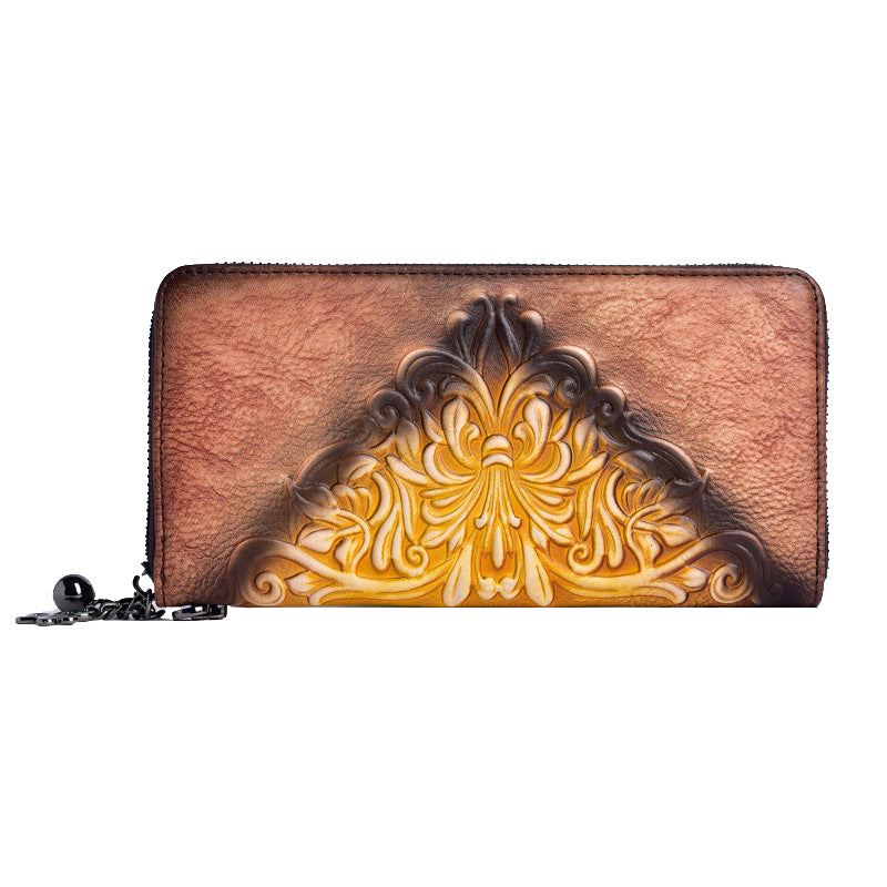 Womens Flowers Coffee Leather Zip Around Wallet Wristlet Wallet Floral Ladies Zipper Clutch Wallet for Women