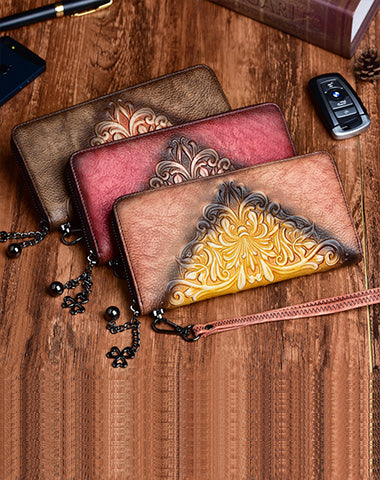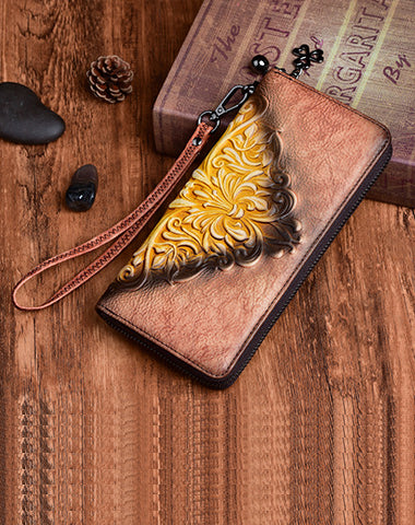 Design: Womens Flowers Leather Zip Around Wallet Wristlet Wallet Floral Ladies Zipper Clutch Wallet for Women