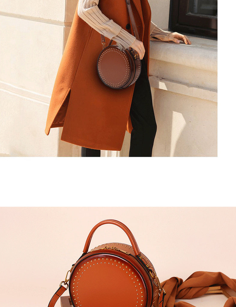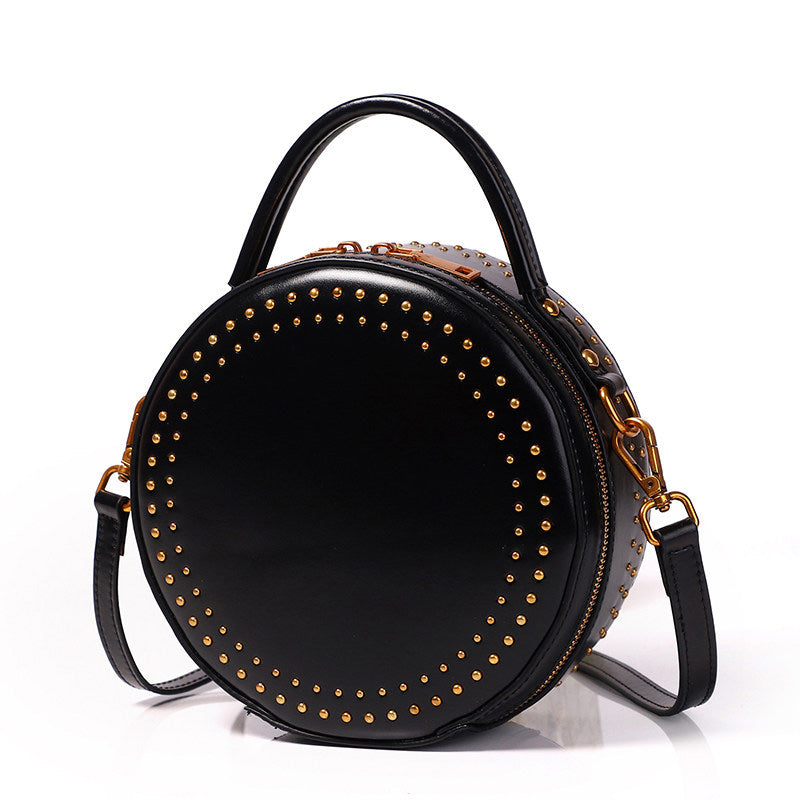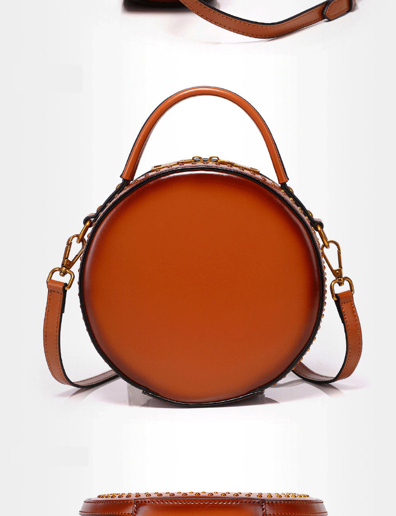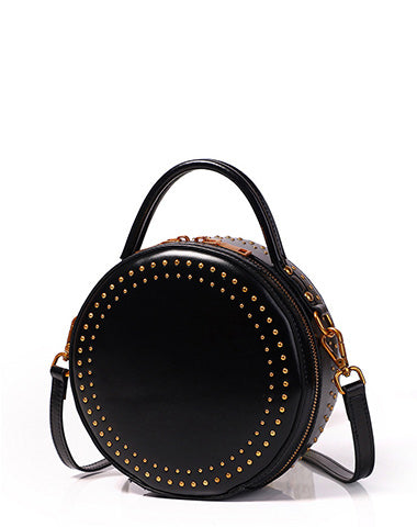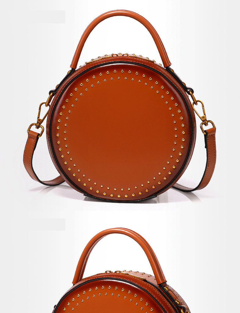 Design: Womens Green Leather Round Handbag with Rivet Crossbody Purse Green Round Shoulder Bag for Women