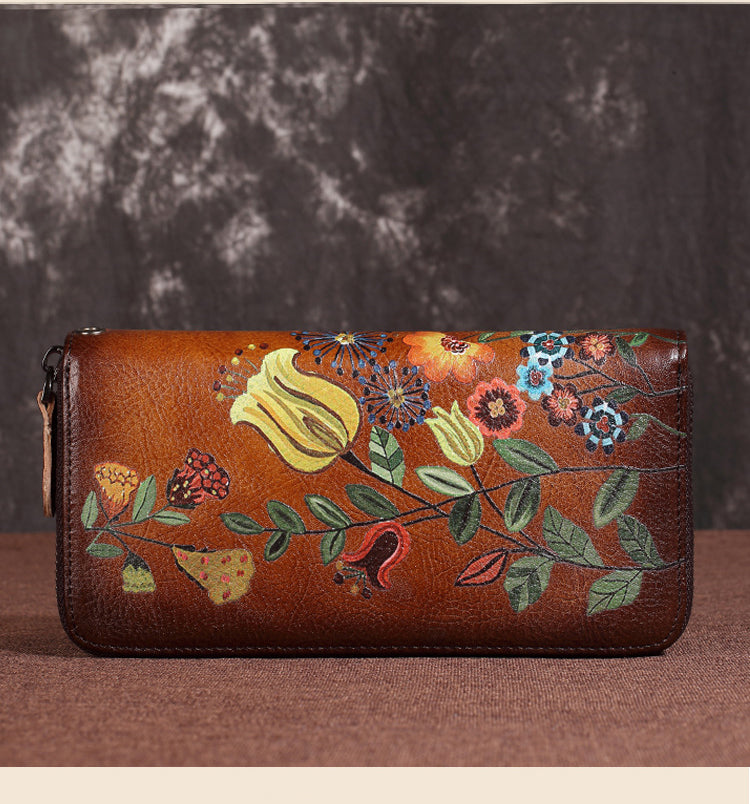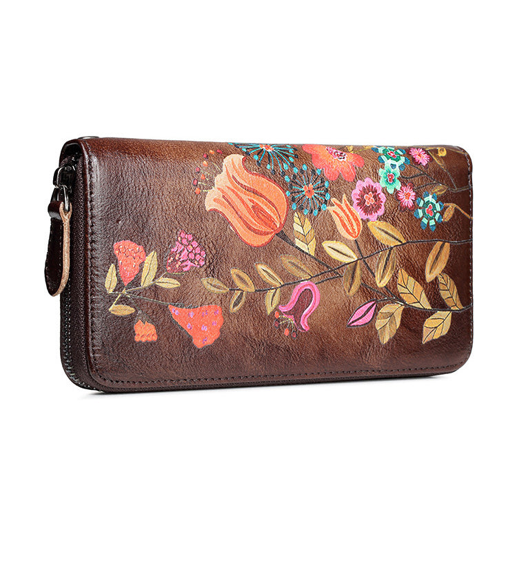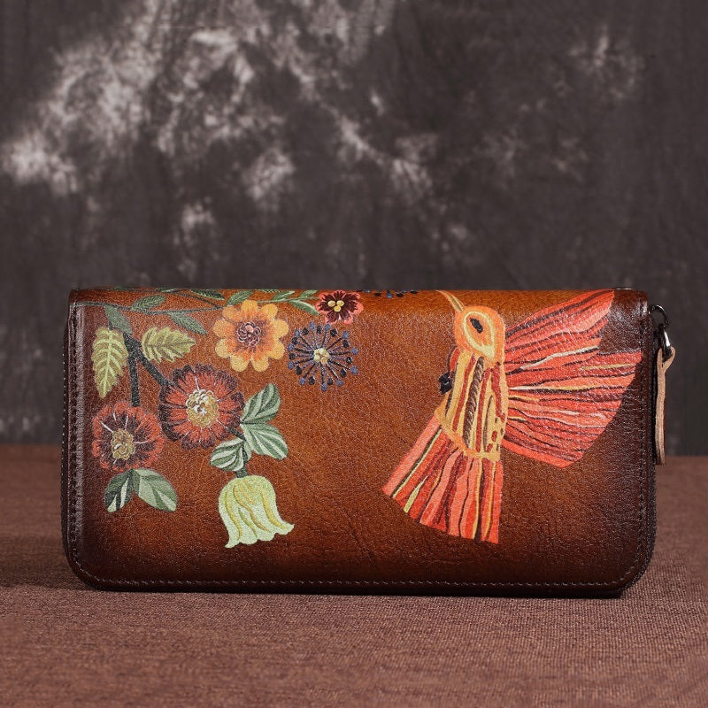 Style: Womens Hummingbird Brown Leather Wristlet Wallet Floral Ladies Clutch Wallet Zip Around Wallet for Women