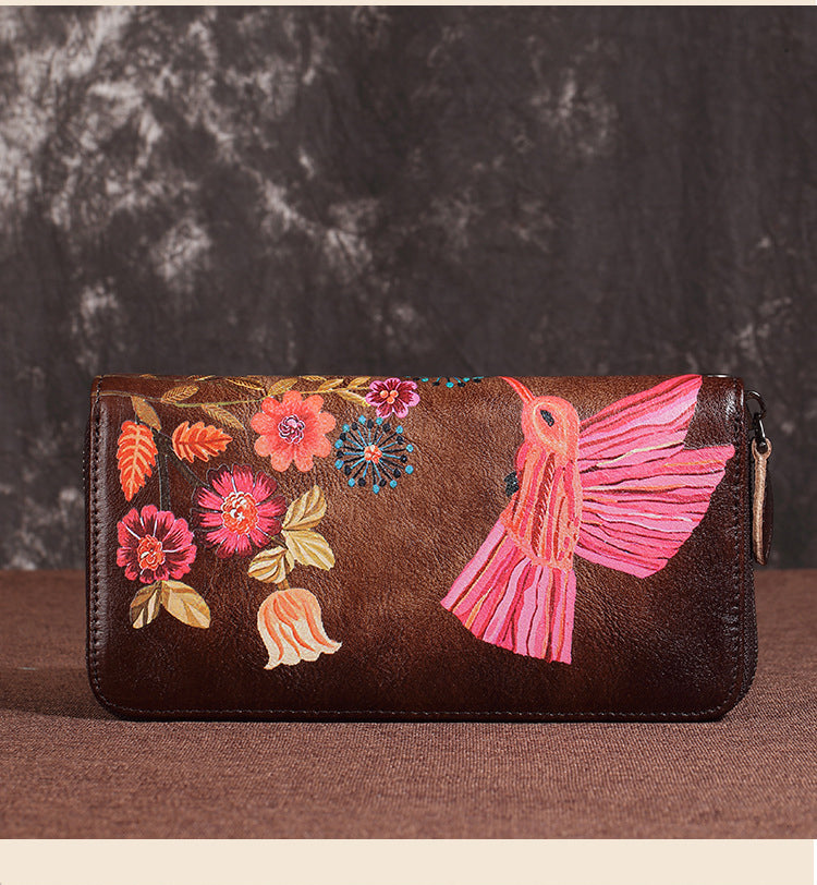 Design: Womens Hummingbird Brown Leather Wristlet Wallet Floral Ladies Clutch Wallet Zip Around Wallet for Women