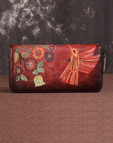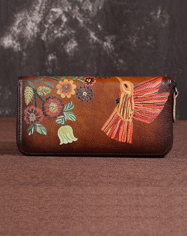 Style: Womens Hummingbird Brown Leather Wristlet Wallet Floral Ladies Clutch Wallet Zip Around Wallet for Women