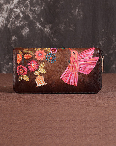 Design: Womens Hummingbird Brown Leather Wristlet Wallet Floral Ladies Clutch Wallet Zip Around Wallet for Women