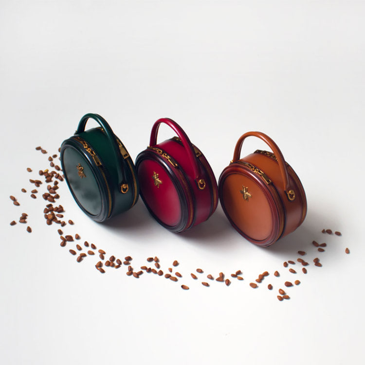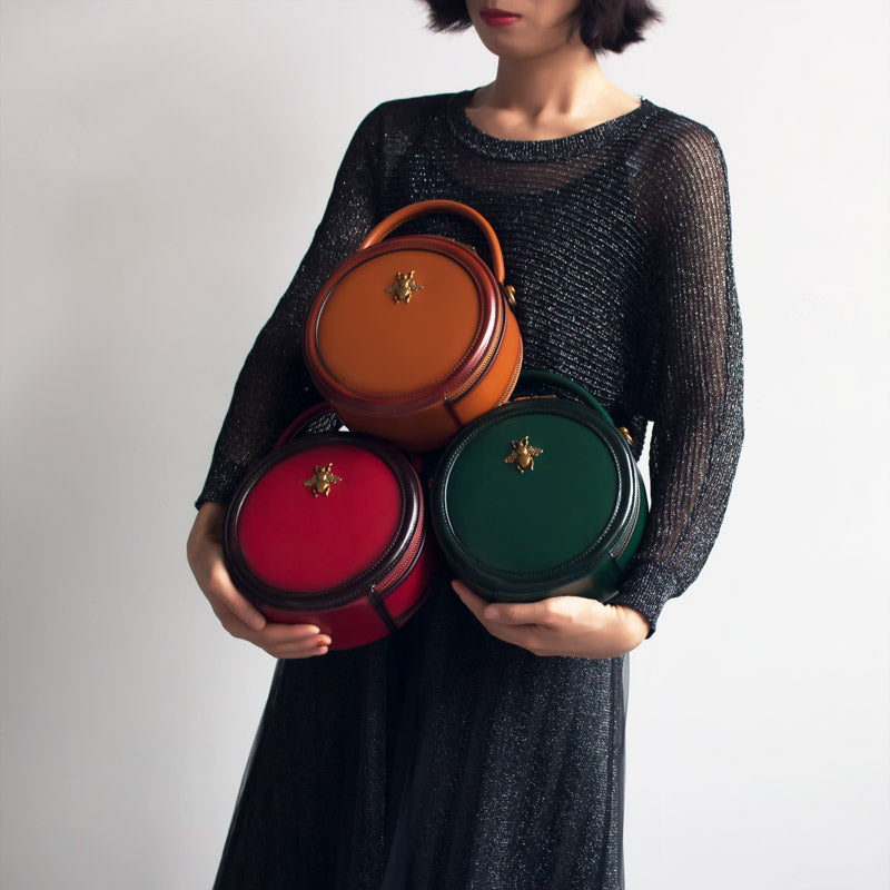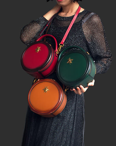 Design: Womens Red Leather Small Round Handbag Crossbody Purse Round Shoulder Bag for Women
