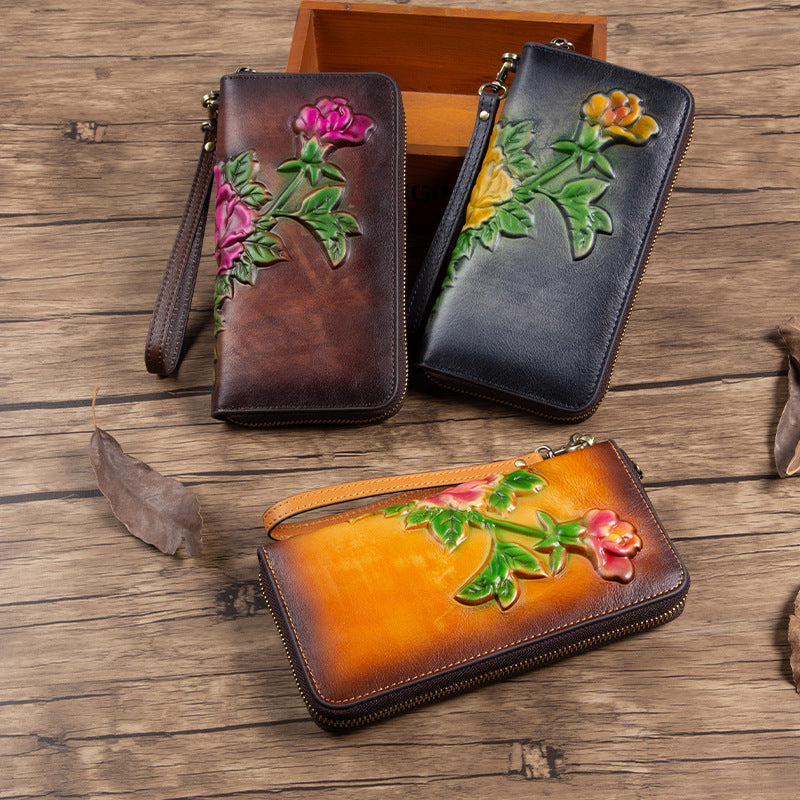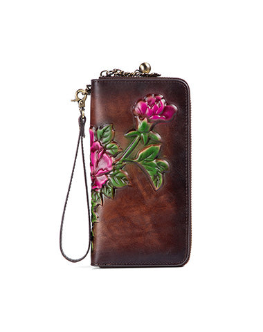 Design: Womens Leather Zip Around Wallet Peony Flower Wristlet Wallet Floral Ladies Zipper Clutch Wallet for Women