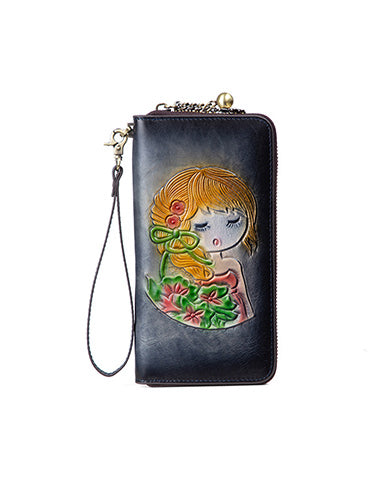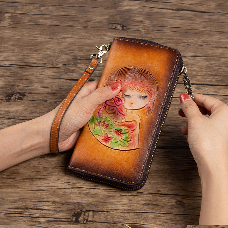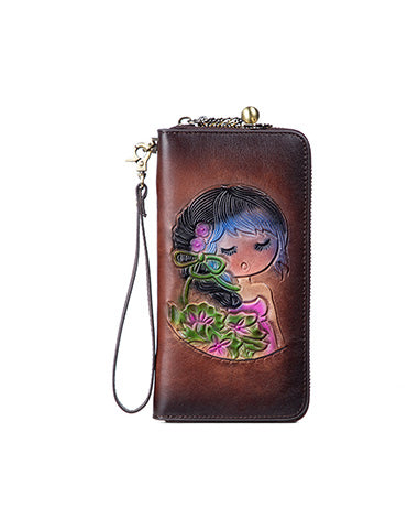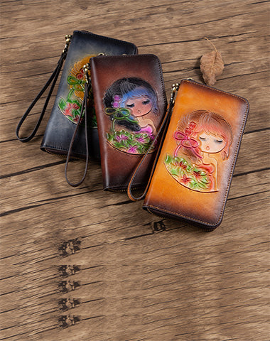 Womens Leather Zip Around Wallets Singing Girl Wristlet Wallets Flower Ladies Zipper Clutch Wallet for Women