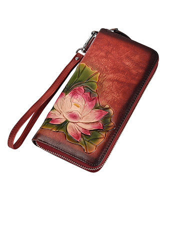 Style: Womens Lotus Flower Black Leather Zip Around Wallet Wristlet Wallet Flower Ladies Zipper Clutch Wallet for Women