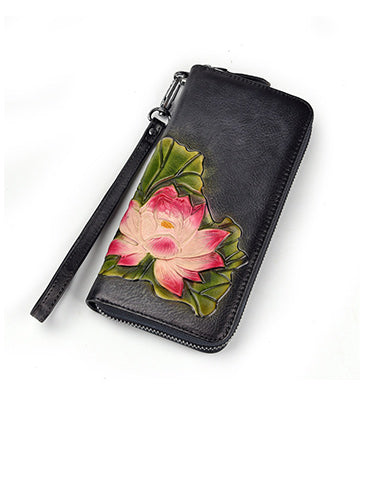 Design: Womens Lotus Flower Black Leather Zip Around Wallet Wristlet Wallet Flower Ladies Zipper Clutch Wallet for Women