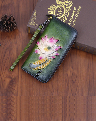 Design: Womens Lotus Flower Brown Leather Wristlet Wallets Zip Around Wallet Flower Ladies Zipper Clutch Wallet for Women