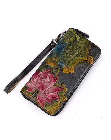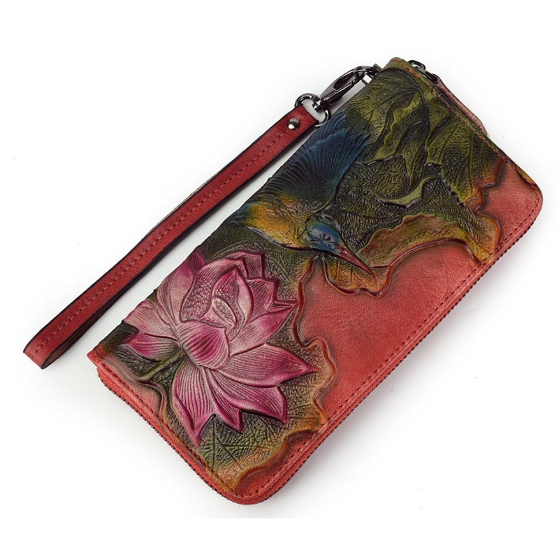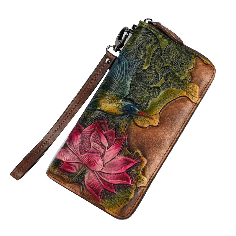 Style:Womens Lotus Flower&Hummingbird Leather Zip Around Wallet Wristlet Wallet Flower Ladies Zipper Clutch Wallet for Women