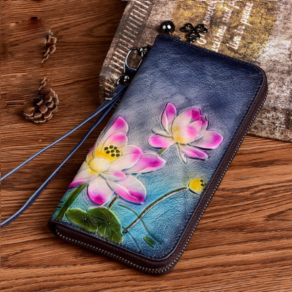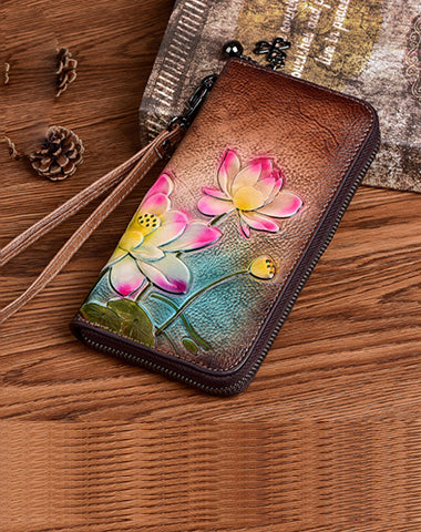 Design: Womens Lotus Flowers Brown Leather Wristlet Wallets Zip Around Wallet Flowers Ladies Zipper Clutch Wallet for Women