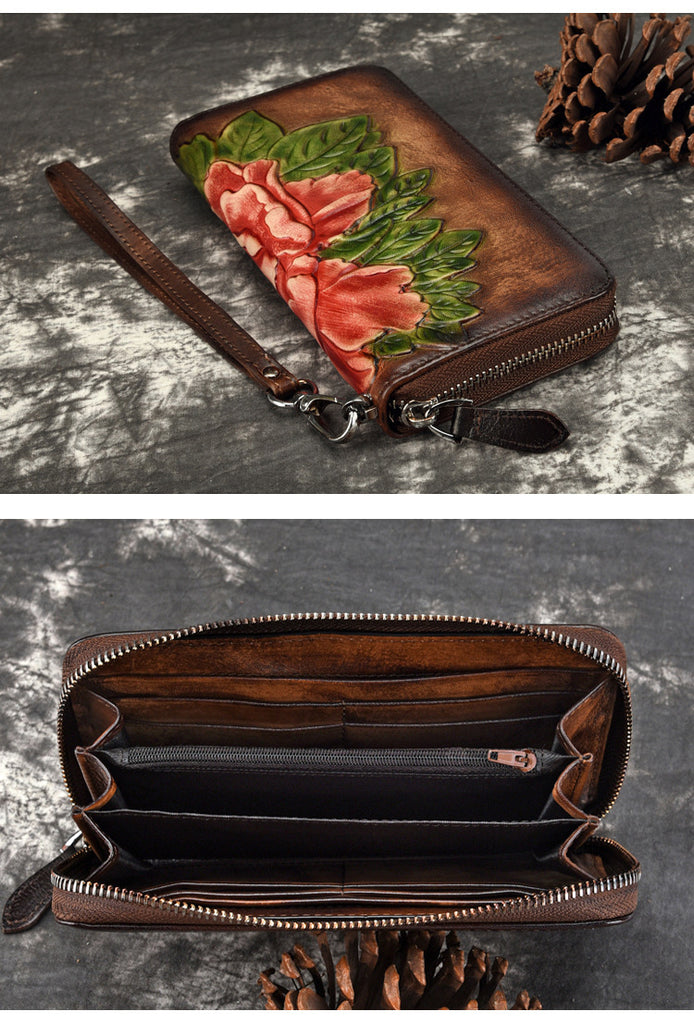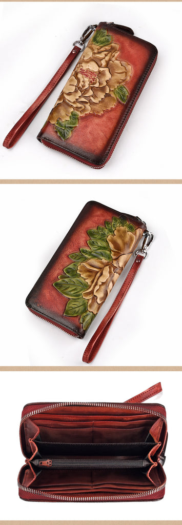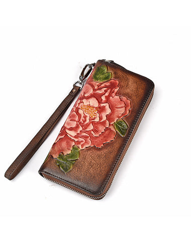 Design: Womens Peony Flower Leather Wristlet Wallet Zip Around Wallets Floral Ladies Zipper Clutch Wallet for Women