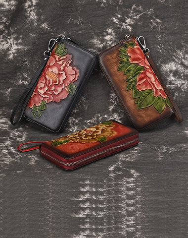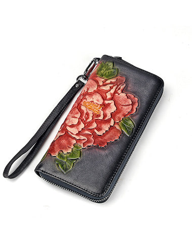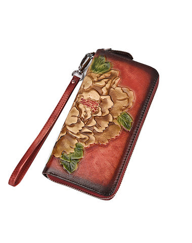 Womens Peony Flower Red Leather Wristlet Wallet Zip Around Wallets Floral Ladies Zipper Clutch Wallet for Women